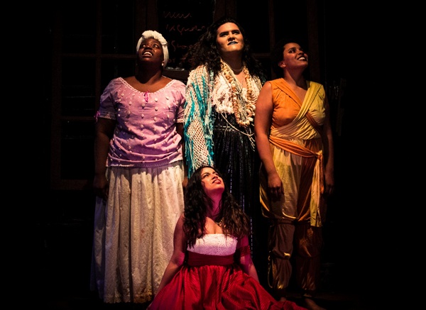 As atrizes que interpretam as quatro mulheres - Bendita/Nanã, Marta/Iemanjá Maria/Iansã, e Joana Nega Su/Obá - são Ellen Rio Branco, Lua Lucas, Luara Sanches e Thábata Letícia, respectivamente. Segundo Antonia, “a poética cênica é atravessada por elementos e saberes ancestrais, dentro de um tempo/espaço espiralado que aponta para as reminiscências de um passado sagrado, buscando fortalecer o presente e deslumbrar o futuro”. A origem da humanidade na África e a fundação de Cidade Tiradentes são contadas simultaneamente: o passado sagrado se revela no presente e no passado recente.